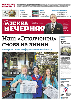 «Вечерняя Москва» — ежедневная российская вечерняя газета, старейшее из вечерних изданий в России, учрежденное в 1923 году. Выходит пять дней в неделю, кроме субботы и воскресенья. Отличается тем, что рассказывает о событиях еще не завершившегося дня. Оперативно освещает хронику и особенности жизни Москвы, охватывает все слои общества и большинство профессиональных и возрастных групп читателей.Издание представлено тремя выпусками – утренним ежедневным, вечерним (выходит три раза в неделю), еженедельным (выходит по четвергам).