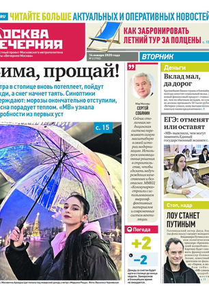 «Вечерняя Москва» — ежедневная российская вечерняя газета, старейшее из вечерних изданий в России, учрежденное в 1923 году. Выходит пять дней в неделю, кроме субботы и воскресенья. Отличается тем, что рассказывает о событиях еще не завершившегося дня. Оперативно освещает хронику и особенности жизни Москвы, охватывает все слои общества и большинство профессиональных и возрастных групп читателей.Издание представлено тремя выпусками – утренним ежедневным, вечерним (выходит три раза в неделю), еженедельным (выходит по четвергам).